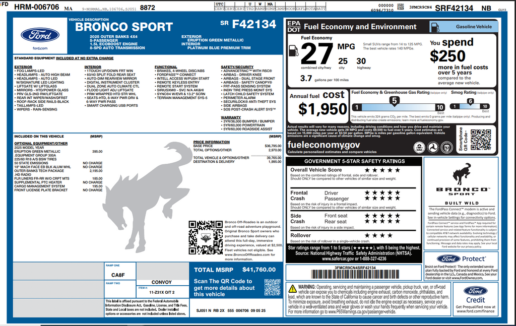 2025 Ford Bronco Sport Outer Banks Price includes: $1500 - Retail Customer Cash. Exp. 03/31/2026 $500 - Bonus Customer Cash. Exp. 03/31/2026