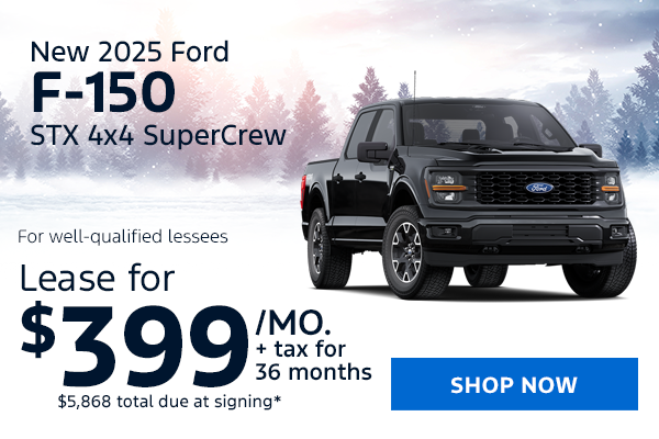 *Lease a New 2025 Ford F-150 STX 4x4 SuperCrew with 2.7L V6 EcoBoost engine for $399/mo (STOCK# RF8954, MSRP $54,430) Well-qualified lessees may lease for $399/mo for 36 months with $5,868 total due at signing (includes down payment, first monthly payment, bank acq fee, $784 doc & title prep fees, $0 security deposit). Sales tax, title, reg/license fees additional. Closed end lease. 10,500 miles/year. Lease end purchase option $36,755. See dealer for complete lease details. Not all will qualify. All incentives to dealer, cannot be combined with other offers. Take delivery by 3/2/2026.